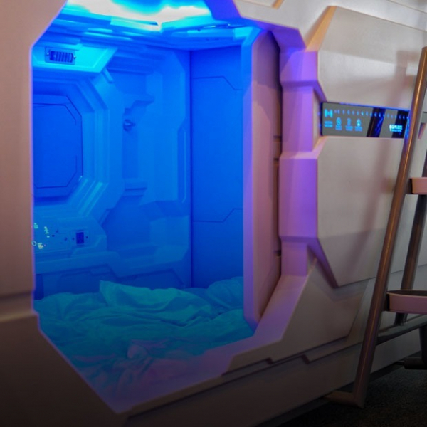 Из любопытства нажимаю на все сенсорные кнопки, проверяю, как что работает. Внутри капсулы можно настроить два света: за зеркалом освещение желтое, а под потолком — фиолетовый неон: здесь мог бы снимать Ридли Скотт. На сенсорной панели под зеркалом есть кнопка тревоги, кнопка для открытия двери, разъемы для наушников, USB и сейф. Внутри капсулы можно даже настроить температуру, установить будильник и включить режим сна.
